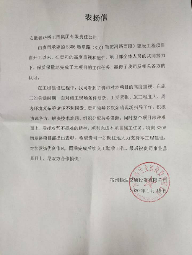 2020年1月15日,S306墩阜路項目收到業(yè)主宿州暢達(dá)交通投資有限公司《表揚信》。
