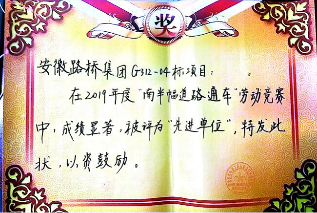 2019年11月底,六安G312改擴(kuò)建項目榮獲業(yè)主頒發(fā)的2019年度“南半幅道路通車”勞動競賽“先進(jìn)單位”稱號。