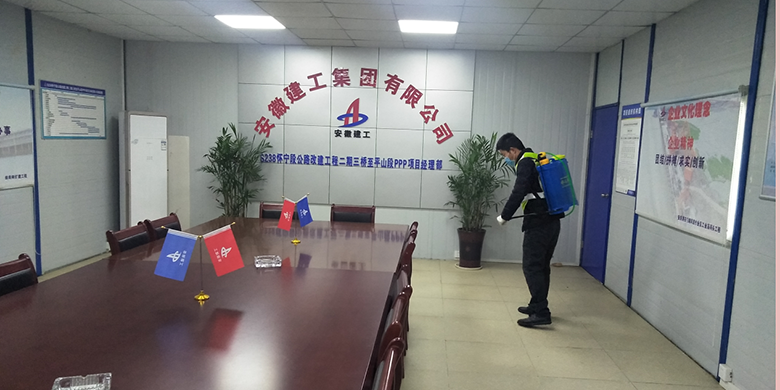 (支部發(fā)展對象王自偉對懷寧PPP項目部會議室進行消毒)