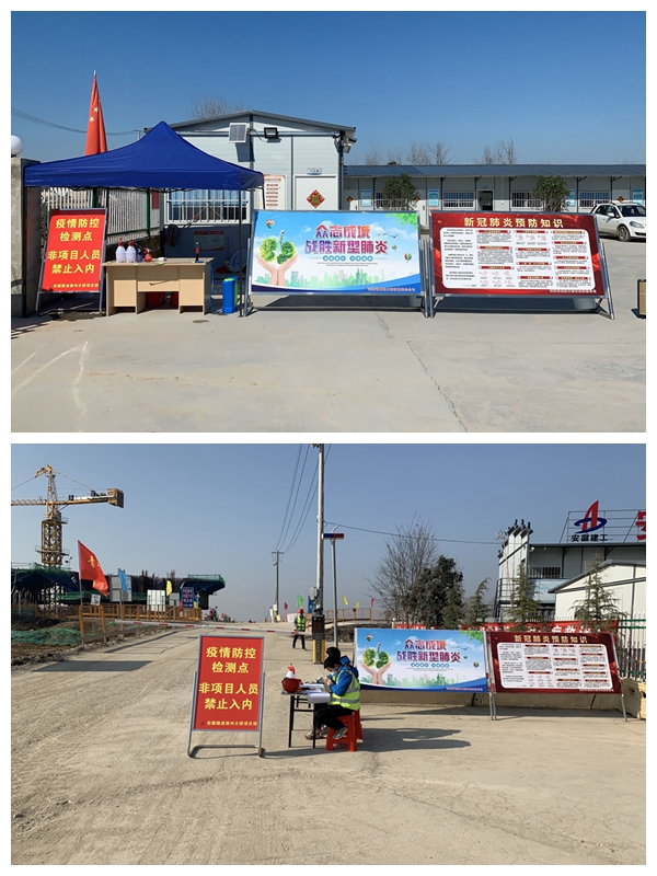 為響應業(yè)主封閉施工要求,在項目起點、終點、臨近村莊道路及項目部唯一一個出入口共設置4個疫情防控檢測點。其中2個用于禁止人員進出,另外2個主要對項目人員防護、車輛排查、人員登記、體溫等進行檢測檢查。