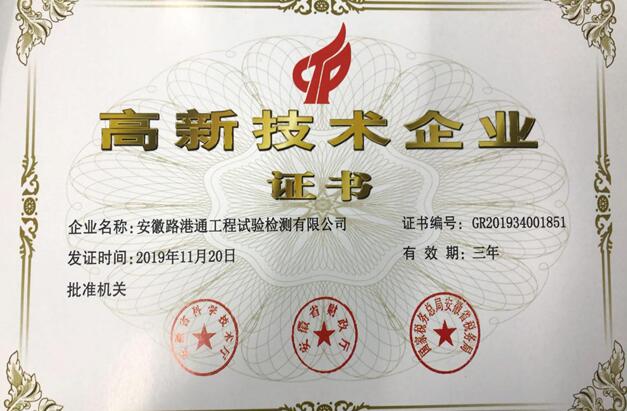 3月9日,科學技術部和高技術產(chǎn)業(yè)開發(fā)中心聯(lián)合發(fā)布《關于2019年第二批高新技術企業(yè)備案的復函》(國科火字〔2019〕6號),安徽路港通工程試驗檢測有限公司取得“高新技術企業(yè)”榮譽證書。