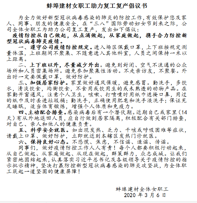 此外,所屬各單位的女職工們也毫不退卻,堅(jiān)守 “疫”線,用女性特有的堅(jiān)韌和細(xì)膩,扛起疫情防控的重任,展現(xiàn)巾幗力量。機(jī)關(guān)女性黨員們主動(dòng)請(qǐng)纓,積極參加“黨員先鋒崗活動(dòng)”,每天輪流為全體職工測(cè)量體溫、做好記錄,用自己的力量扛起責(zé)任和擔(dān)當(dāng),為機(jī)關(guān)員工的安全保駕護(hù)航。安徽瑞特全體女職工自愿成立了疫情防控“女子突擊隊(duì)”,主動(dòng)承擔(dān)起公司行政樓執(zhí)勤工作,她們不辭辛苦,義無(wú)反顧,為公司員工守住“最后一道防線”。蚌埠建材全體女職工在“三八”國(guó)際勞動(dòng)?jì)D女節(jié)到來(lái)之際發(fā)出倡議,號(hào)召全體職工主動(dòng)承擔(dān)社會(huì)責(zé)任,積極主動(dòng)復(fù)工復(fù)產(chǎn),奮力奪取疫情防控和公司發(fā)展的雙勝利。
