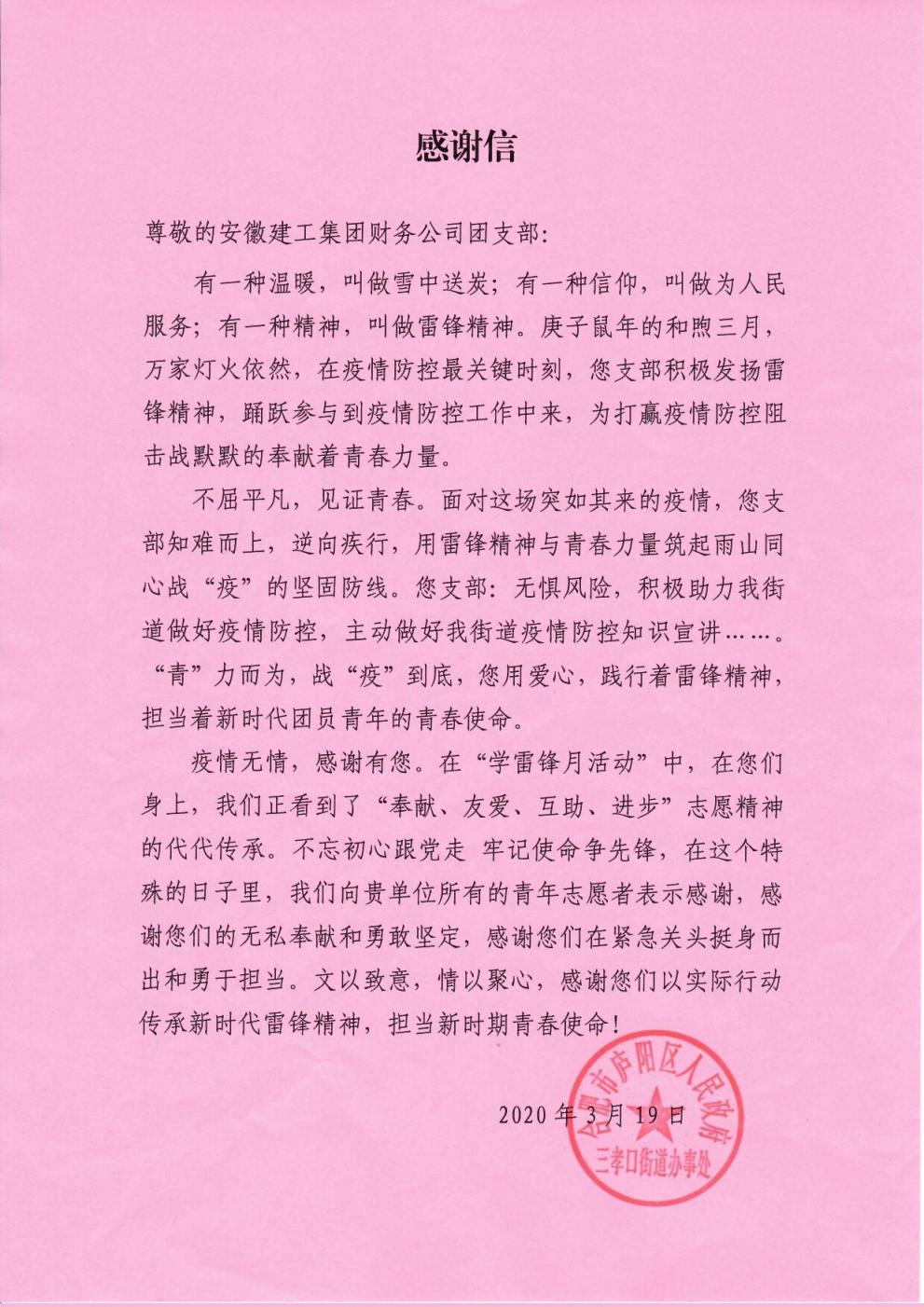 疫情當(dāng)前,正值“學(xué)雷鋒月”到來(lái),為大力傳承和弘揚(yáng)雷鋒精神,3月19日下午,安建財(cái)務(wù)團(tuán)支部與合肥市廬陽(yáng)區(qū)三孝口街道辦事處聯(lián)合開(kāi)展了以傳承和弘揚(yáng)雷鋒精神為主題,以助力社區(qū)做好抗“疫”工作為載體的“學(xué)雷鋒月”志愿服務(wù)活動(dòng)。