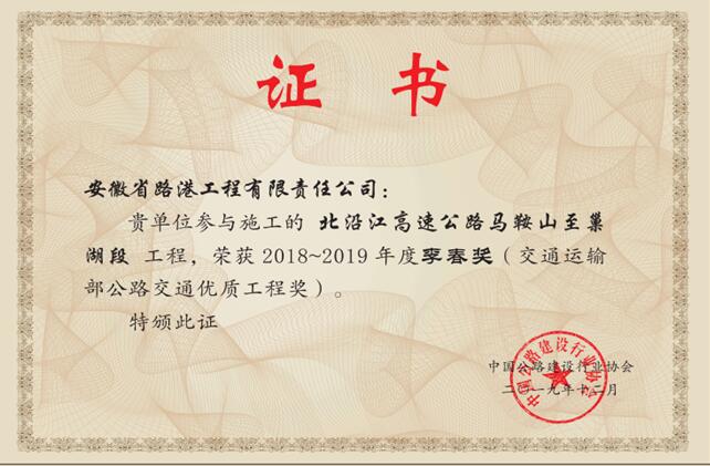 近日,從中國(guó)公路建設(shè)行業(yè)協(xié)會(huì)傳來(lái)喜訊,安徽路港公司承建的北沿江高速公路馬鞍山至巢湖段工程榮獲2018~2019年度李春獎(jiǎng)(交通運(yùn)輸部公路交通優(yōu)質(zhì)工程獎(jiǎng))。