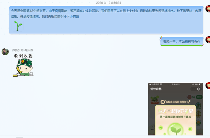 沛縣公司團支部通過QQ群向各位沛縣團員青年發(fā)起了網(wǎng)上植樹節(jié)活動——“螞蟻森林互聯(lián)網(wǎng)植樹節(jié)”。團員青年積極響應(yīng),并曬出自己的螞蟻森林植樹節(jié)勞動成果,親手在線上為春天種下了希望。同時組織開展“青年大學(xué)習(xí)”團課學(xué)習(xí),通過QQ群、微信客戶端有計劃地組織青年團員學(xué)習(xí)疫情期間防控知識,了解新型冠狀病毒的傳播途徑及如何進行自我保護、學(xué)習(xí)奮戰(zhàn)在一線的抗疫情人員不屈不撓、奉獻自我的精神。