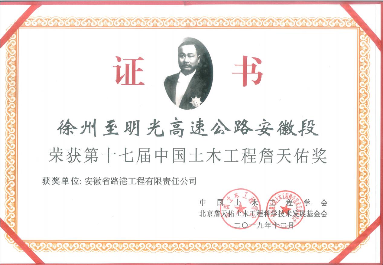 近日,從中國土木工程學(xué)會傳來喜訊,安徽省路港公司承建的徐州至明光高速公路安徽段榮獲第十七屆中國土木工程“詹天佑”獎。這也是我公司繼銅黃高速、沿江高速蕪湖至安慶段、馬鞍山長江公路大橋后再次獲得該項大獎。