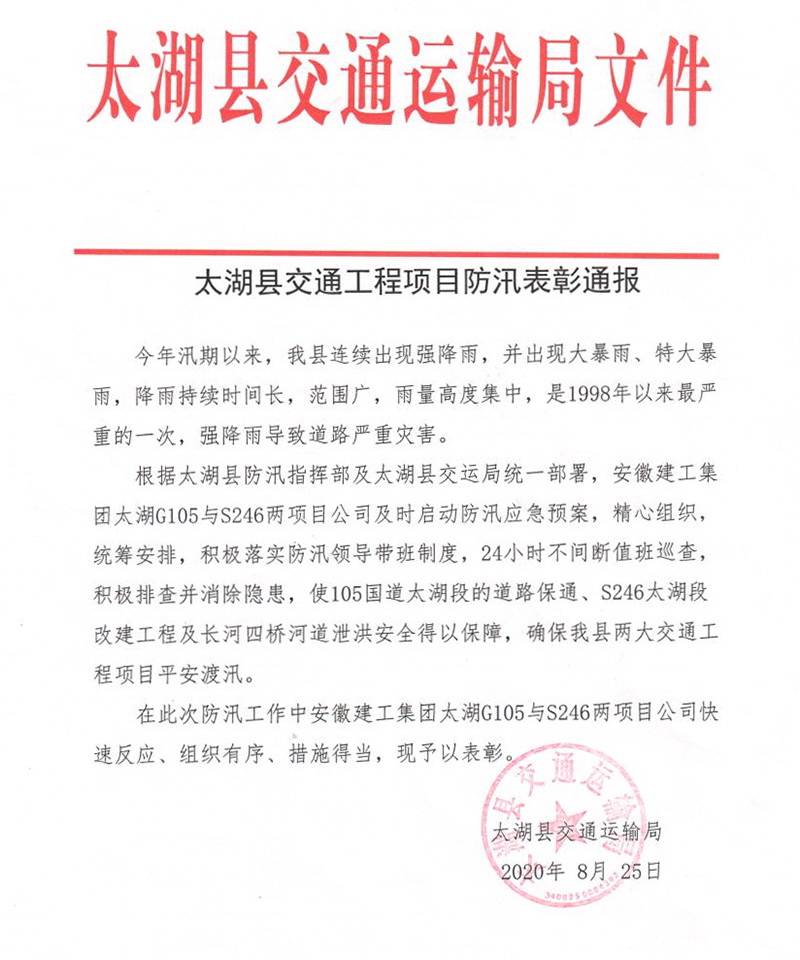 8月27日,安徽建工集團(tuán)太湖G105、S246兩PPP項(xiàng)目公司喜獲太湖縣交通運(yùn)輸局工程項(xiàng)目防汛表彰通報(bào)!