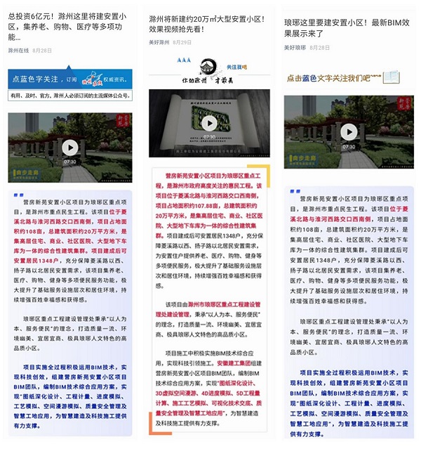 近期,關于安建總承包第一公司滁州營房新苑項目BIM技術運用效果展示的報道,先后在“美好滁州”(主辦單位中共滁州市委宣傳部)、“滁州在線”(主辦單位滁州日報社)、“美好瑯琊”(主辦單位中共滁州市瑯琊區(qū)委宣傳部)等當地官方媒體微信公眾號上發(fā)布轉載。滁州營房新苑項目積極實施BIM技術綜合應用,推進智慧建造、科技引領施工,提升了安徽建工在滁州市場的知名度,項目建設獲得了瑯琊區(qū)的肯定和好評。