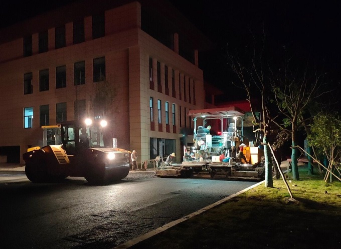 績溪黨校項目研學樓前連夜攤鋪瀝青路面