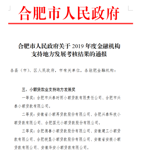 近日,《合肥市人民政府關(guān)于2019年度金融機(jī)構(gòu)支持地方發(fā)展考核結(jié)果通報》中,安建小貸榮獲“小額貸款業(yè)支持地方發(fā)展獎”三等獎,這也是安建小貸繼前兩年獲得該獎后第三次獲得該榮譽(yù)。