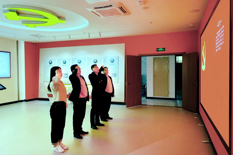 參觀結(jié)束后,支部書記錢波帶領(lǐng)大家面對黨旗一起重溫了入黨誓詞。
