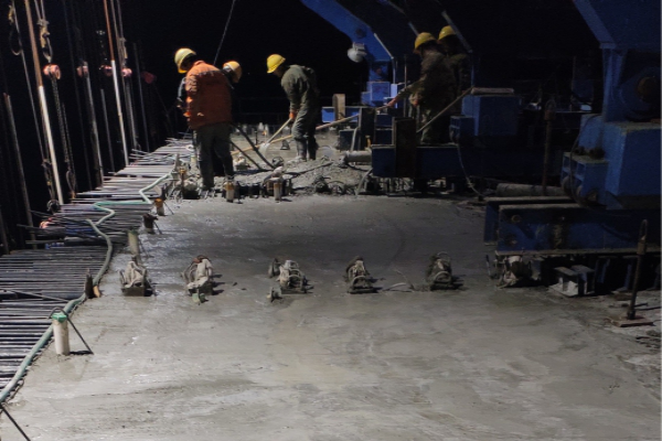 11月4日晚,主橋施工現(xiàn)場(chǎng)熱火朝天,第8號(hào)墩6號(hào)塊正在澆筑施工,領(lǐng)導(dǎo)班子們輪流值班,嚴(yán)格控制澆筑時(shí)混凝土振搗等工序,現(xiàn)場(chǎng)技術(shù)人員及安全人員全程旁站,全力為6號(hào)塊澆筑成功保駕護(hù)航。