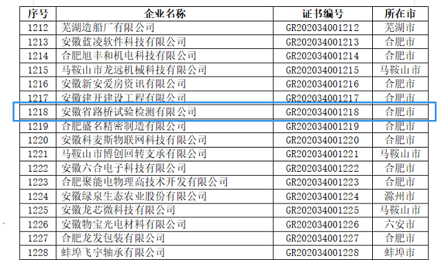 2020年12月4日,安徽省路橋試驗檢測有限公司(簡稱“檢測公司”)榮獲安徽省2020年度第一批“高新技術(shù)企業(yè)”認定資格(證書編號GR202034001218),成為安徽省路橋工程集團有限責(zé)任公司二級機構(gòu)第一家高新技術(shù)企業(yè),標(biāo)志著檢測公司的企業(yè)技術(shù)實力和科研成果獲國家認可,正式邁入國家高新技術(shù)企業(yè)行列。