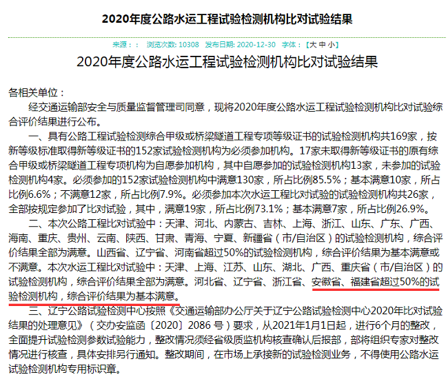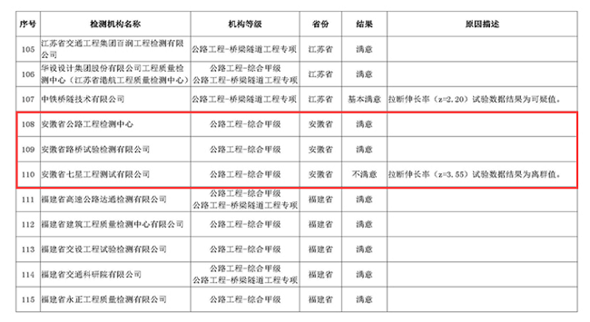 2020年10月,交通運輸部組織了“2020年度公路水運工程試驗檢測比對試驗”。檢測公司領導班子高度重視本次對比實驗,成立比對試驗組,參加了防水材料片材拉伸強度及拉斷伸長率(斷裂伸長率)的比對試驗。12月30日,交通部比對試驗結果反饋,檢測公司獲得了“滿意”評價。據(jù)了解,全國共有165家綜甲機構參與本次比對試驗,安徽省有4家綜甲機構參加公路工程檢測對比試驗,獲得“滿意”評價的僅2家。檢測公司作為安徽省獲評“滿意”兩家綜甲機構之一,表明其技術實力在部考中代表了安徽省先進水平,已經(jīng)躋身安徽省公路工程試驗檢測領域第一梯隊。