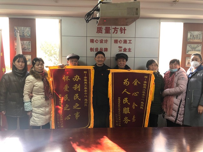 1月12日上午,服務(wù)中心迎來了一群熱情洋溢的居民,手捧兩面分別寫有“辦利民之事,懷愛民之心”、“全心全意為人民服務(wù)”的錦旗,原來是安徽省機械施工公司龍崗集資樓24戶代表為感謝服務(wù)中心黨總支書記、總經(jīng)理施愛民同志盡職盡責(zé)、不計得失、辛勤付出,為他們解決了12年來的“急難愁盼”問題。他們一到來,其中一位代表就說施總你好,感謝你為我們解決了多年的難題,為群眾辦了實事,我們今天特地送上錦旗表達(dá)感激之情……”。