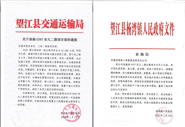 2021新年伊始,安徽路橋集團(tuán)G347PPP項(xiàng)目接連收到望江縣楊灣鎮(zhèn)人民政府、望江縣交通局表揚(yáng)信。