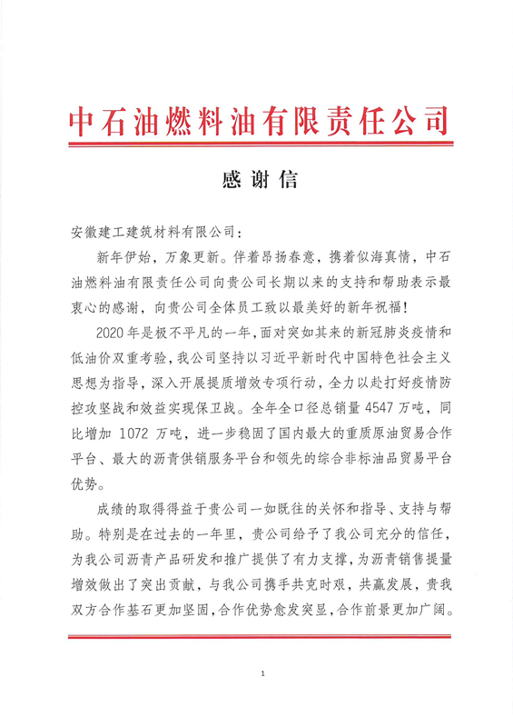 此次中石油燃料油公司給安建建材送來感謝信,標(biāo)志著雙方合作邁向了一個新的臺階。隨著雙方的合作升級,相信在未來能夠繼續(xù)深入探討共贏新模式,開辟合作新征程。