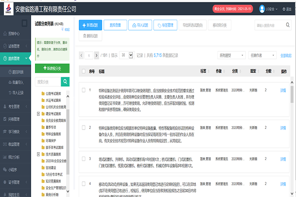 通過使用線上平臺(tái),建立包含特種設(shè)備、環(huán)境保護(hù)、駐地建設(shè)、節(jié)后復(fù)工、疫情防控、崗前考試、全員安全教育等11類、5715道試題的題庫(kù),安全教育不再受時(shí)間和距離制約,近年來安全教育頻率大幅度提升。