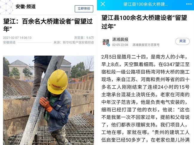 近日,新華社、《瀟湘晨報(bào)》對(duì)安徽路橋集團(tuán)G347安九二期望江至宿松段一級(jí)公路工程項(xiàng)目的100余名大橋建設(shè)者“留望過(guò)年”進(jìn)行了相關(guān)報(bào)道。