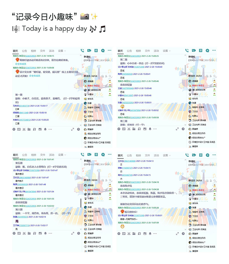 雖是線上猜燈謎活動,但是黨員們活動熱情不減,安徽建科設(shè)計黨支部全體黨員通過支部QQ群積極踴躍猜謎搶答,整個支部群里充滿著節(jié)日的喜慶。本次燈謎除了傳統(tǒng)謎題之外,還包含了黨建知識和疫情防控的相關(guān)內(nèi)容。