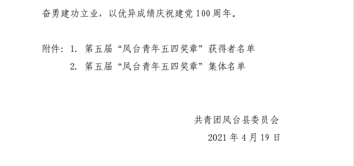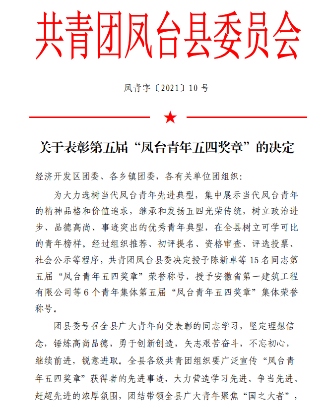 近日,共青團鳳臺縣委員會頒布鳳青字〔2021〕10號文《關于表彰第五屆“鳳臺青年五四獎章”的決定》,文件中對15位同志、6個集體做出“鳳臺青年五四獎章”表彰決定,其中安徽省第一建筑工程有限公司榮獲“鳳臺青年五四獎章”集體榮譽稱號!