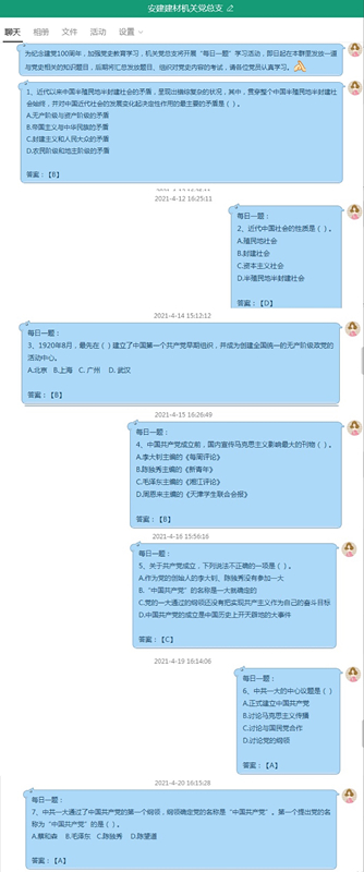 形式多樣、內(nèi)容鮮活、入腦入心,是安建建材機(jī)關(guān)黨總支開展黨史學(xué)習(xí)教育的鮮明特色。為了確保學(xué)習(xí)有重點、有載體、有平臺,機(jī)關(guān)黨總支還開展了“每日一題”黨史學(xué)習(xí)活動,依托線上平臺將黨史教育落到實處。