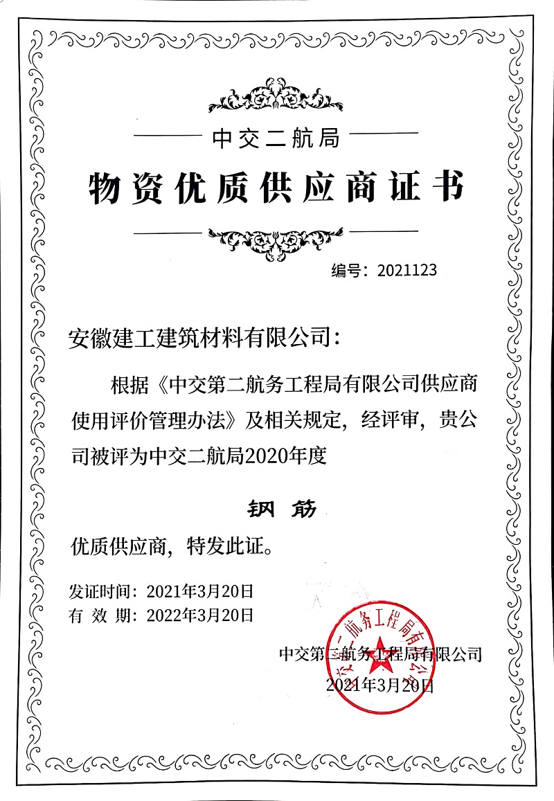 近日,中交第二航務工程局有限公司進行2020年度優(yōu)秀供應商評選,安建建材憑借優(yōu)質(zhì)的產(chǎn)品和精心的服務在眾多供應商中脫穎而出,榮獲中交二航局“2020年度優(yōu)秀供應商”稱號。