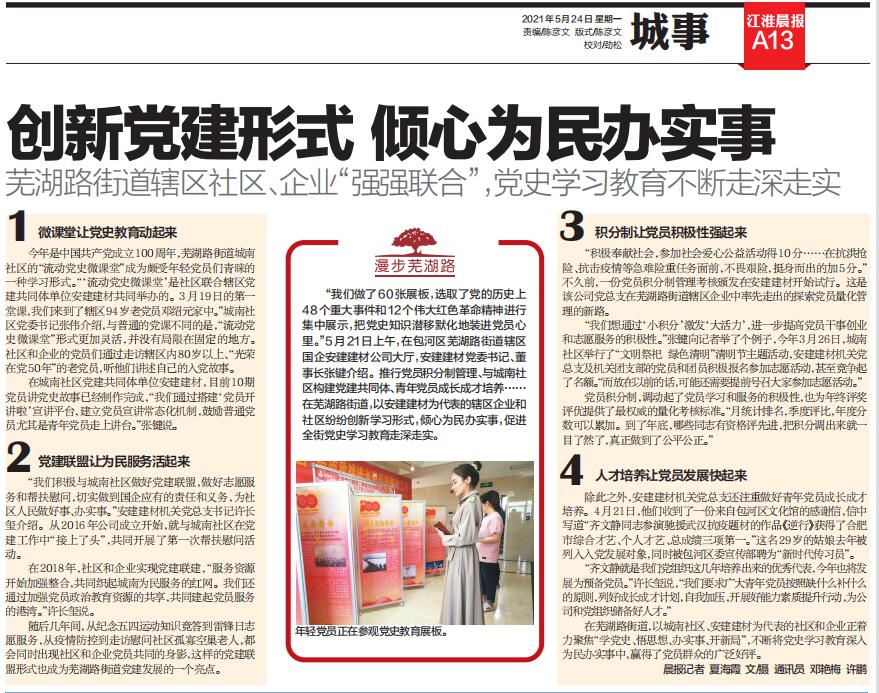 2021年5月24日,《江淮晨報》以“創(chuàng)新黨建形式、傾心為民辦實事”為題,專題報道安建建材黨史學習教育開展情況。《江淮晨報》指出,在蕪湖路街道,以城南社區(qū)、安建建材為代表的的社區(qū)和企業(yè)紛紛創(chuàng)新學習形式,著力聚焦“學黨史、悟思想、辦實事、開新局”,不斷推進黨史學習教育走深走實。同時也在學習強國合肥市學習平臺進行報道。