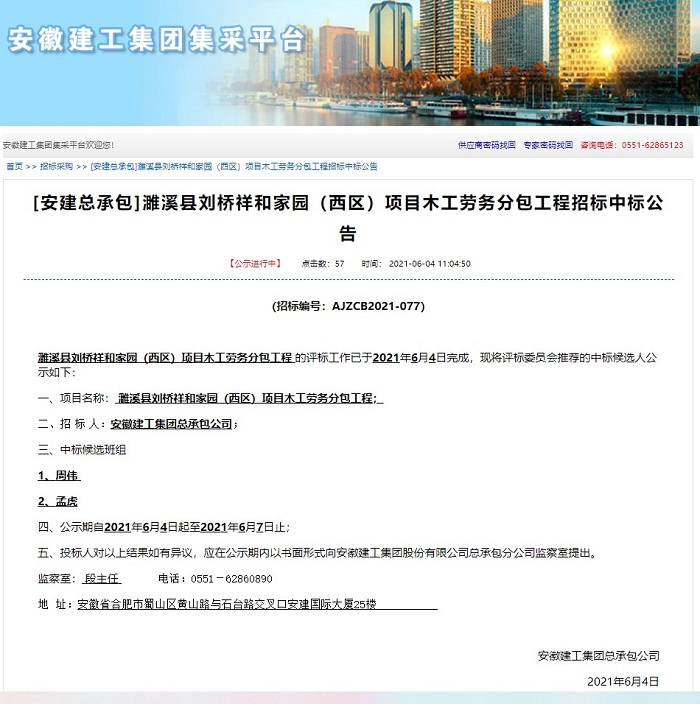 近日,安建總承包勞務(wù)公司首次班組招標(biāo)——濉溪縣劉橋祥和家園棚戶區(qū)改造項目班組勞務(wù)分包工程招標(biāo)工作在安建國際大廈24樓會議室順利完成。
