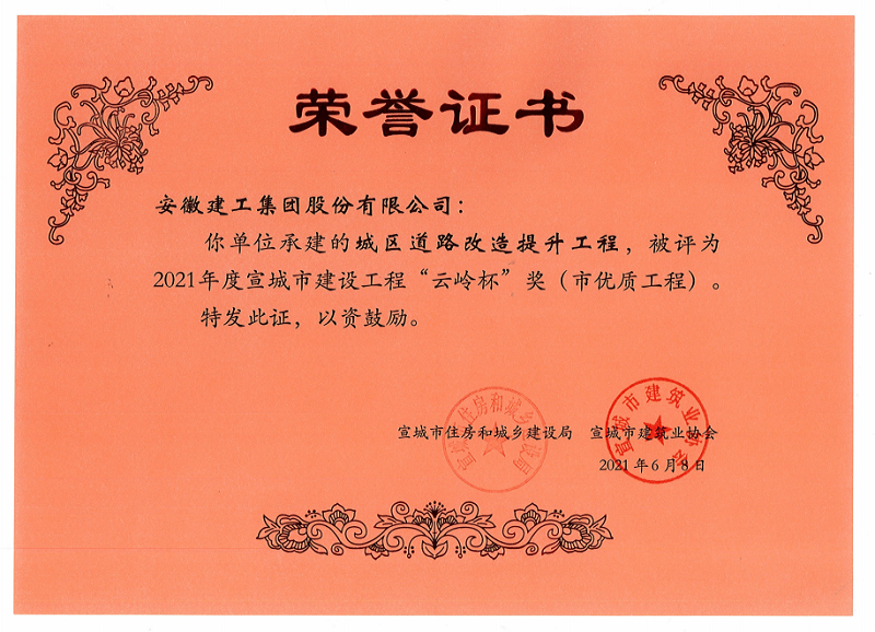 6月8日,安建投資績溪PPP項目城區(qū)改造提升工程喜獲2021年度宣城市建設(shè)工程“云嶺杯”獎。