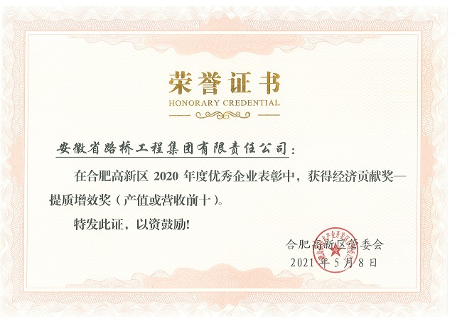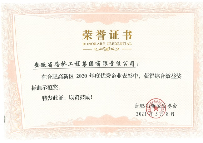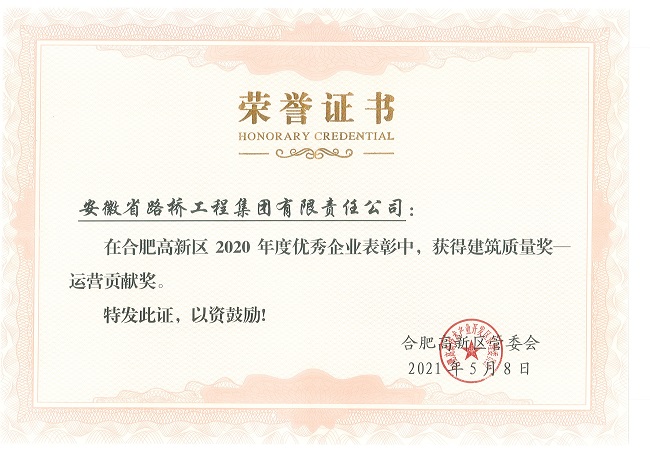 近日,合肥市高新區(qū)管委會公示了《合肥高新區(qū)2020年度擬表彰獎勵項目》企業(yè)名單,安徽路橋集團喜獲“運營貢獻獎”、“提質(zhì)增效獎”、“標準示范獎”三項榮譽。
