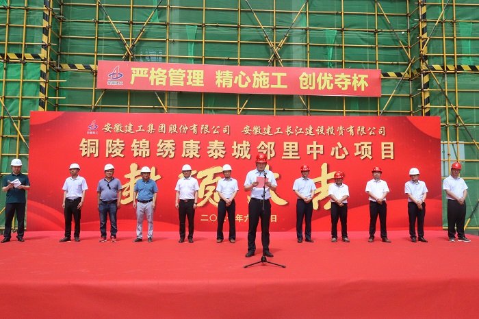 姚應(yīng)凌首先對(duì)項(xiàng)目順利封頂表示熱烈祝賀,并向奮戰(zhàn)在一線的項(xiàng)目管理人員和廣大職工表示衷心感謝。他指出,鄰里中心項(xiàng)目工期緊任務(wù)重,在各參建單位共同努力下,歷時(shí)三個(gè)月實(shí)現(xiàn)主體結(jié)構(gòu)順利封頂,取得了階段性勝利,為項(xiàng)目后續(xù)順利推進(jìn)奠定了堅(jiān)實(shí)基礎(chǔ)。他表示,安徽建工作為省屬大型國企,具有輝煌的歷史,長期以來積極參與城市開發(fā)與建設(shè),為銅陵經(jīng)濟(jì)社會(huì)發(fā)展譜寫了壯麗篇章。