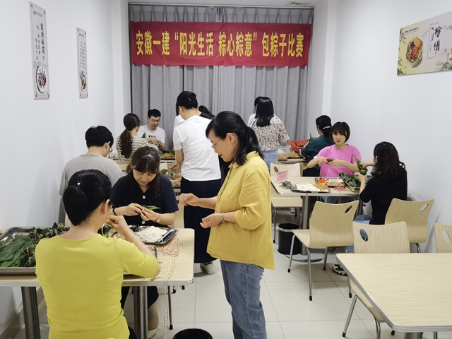 6月10日下午,安徽一建團(tuán)委聯(lián)合工會(huì)、行政保衛(wèi)部在公司機(jī)關(guān)食堂舉行“陽(yáng)光生活 棕心棕意”包粽子比賽活動(dòng)。來(lái)自機(jī)關(guān)的14支隊(duì)伍,共42人參加活動(dòng),公司領(lǐng)導(dǎo)及各部門負(fù)責(zé)人進(jìn)行評(píng)分。