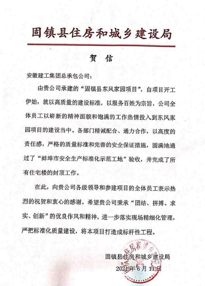 6月11日,安建總承包第四公司固鎮(zhèn)縣東風(fēng)家園棚戶區(qū)改造項目收到縣住建局發(fā)來的賀信,對項目順利通過“蚌埠市安全生產(chǎn)標準化示范工地”驗收、如期完成全部9棟樓順利封頂表示祝賀。