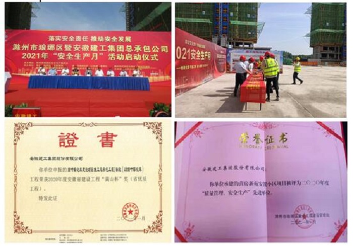 質(zhì)量安全創(chuàng)佳績。壽縣恒大空港小鎮(zhèn)項目搶工成效顯著獲業(yè)主方來信表揚;鳳陽華環(huán)煙葉醇化庫項目4號庫獲得2020年“黃山杯”;阜南祥源公園城項目獲得2020年實用新型專利1項,I類省級優(yōu)秀QC成果1項,II類國家級優(yōu)秀QC成果1項,集團工法1項。滁州營房新苑安置小區(qū)項目被業(yè)主方授予2020年度“質(zhì)量管理、安全生產(chǎn)”先進單位榮譽稱號,順利通過“滁州市安全生產(chǎn)標準化示范工地”和“集團安全生產(chǎn)標準化示范工地”驗收,并榮獲集團2020年度勞動競賽“優(yōu)勝項目部”表彰。六月初,滁州市瑯琊區(qū)暨安建總承包2021年“安全生產(chǎn)月”活動啟動儀式在滁州營房新苑安置小區(qū)項目成功舉辦,為安徽建工在滁州市樹立了省屬大型國企良好品牌形象。