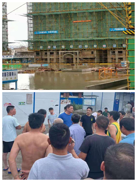 在發(fā)生災(zāi)害的第一時(shí)間項(xiàng)目部立即根據(jù)雨季施工應(yīng)急預(yù)案成立領(lǐng)導(dǎo)小組,組織人員疏散現(xiàn)場(chǎng)工人,確保沒有工人及管理人員被困施工區(qū)。公司副總經(jīng)理代鵬飛在得知消息后,第一時(shí)間驅(qū)車從合肥趕往淮南指導(dǎo)項(xiàng)目救援工作。對(duì)現(xiàn)場(chǎng)臨設(shè)、道路與場(chǎng)地排水、大型設(shè)備、基坑的排水,施工腳手架及安全防護(hù)、機(jī)械設(shè)備的維修保養(yǎng)、現(xiàn)場(chǎng)臨水、臨電的安全都作出了重要指示和要求,同時(shí)也高度贊揚(yáng)了項(xiàng)目部面對(duì)困難時(shí)的強(qiáng)大凝聚力。最后公司副總經(jīng)理代鵬飛親赴工人生活區(qū),對(duì)工人進(jìn)行看望和慰問。