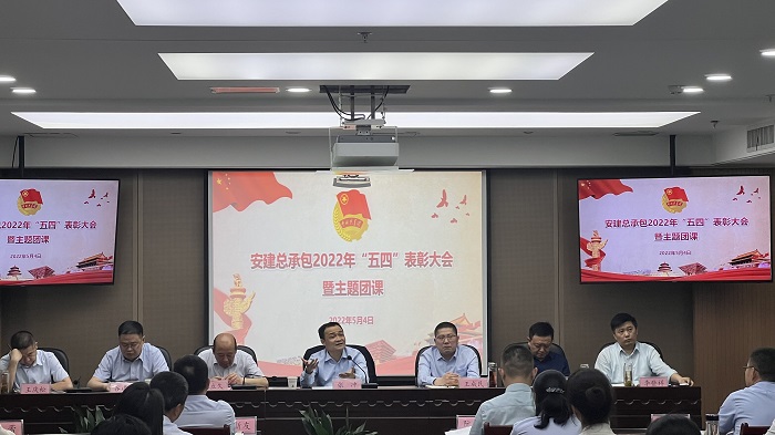 為隆重慶祝中國共產(chǎn)主義青年團成立100周年,在五一假期的5月4日青年節(jié)當天,安建總承包召開2022年“五四”表彰大會。黨委書記、總經(jīng)理張沖作形勢任務教育主題團課,在肥領導王成民、徐友修、谷建偉、李登祥、王慶松為受表彰集體和個人頒獎并寄語青年,紀委書記、工會主席高立久主持。