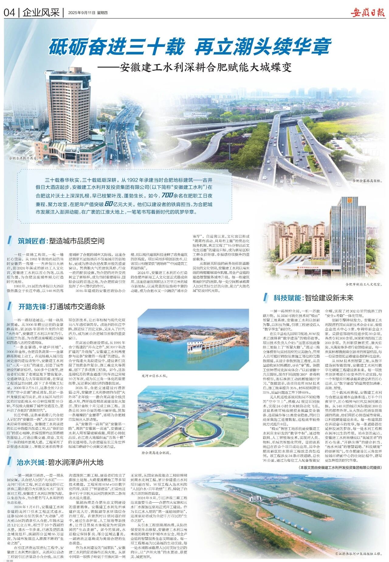 三十載風(fēng)雨兼程,安徽建工水利與合肥這座城市血脈相連;萬(wàn)千個(gè)日夜堅(jiān)守,匠心精神與時(shí)代發(fā)展同頻共振。從148米的城市天際線到300公里的都市外環(huán),從大別山的清泉到巢湖的碧波,他們用匠心鑄造城市脊梁,以科技賦能建設(shè)未來(lái)。每一棟建筑都在訴說(shuō)奮斗的故事,每一條道路都在延伸發(fā)展的夢(mèng)想,每一處水利工程都在潤(rùn)澤民生的希望。站在新的起點(diǎn),安徽建工水利將繼續(xù)以“筑城匠者”的匠心傳承、“開(kāi)路先鋒”的使命擔(dān)當(dāng)、“治水興城”的智慧韜略、“科技賦能”的創(chuàng)新銳氣,在合肥建設(shè)長(zhǎng)三角世界級(jí)城市群副中心的壯闊征程中,譜寫(xiě)更加輝煌的時(shí)代華章。