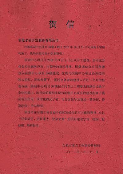 近日,合肥市重點(diǎn)工程局向安徽水利發(fā)來(lái)賀信,祝賀安徽水利合肥分公司承建的濱湖中心項(xiàng)目3#樓工程圓滿完成地下室結(jié)構(gòu)施工。
