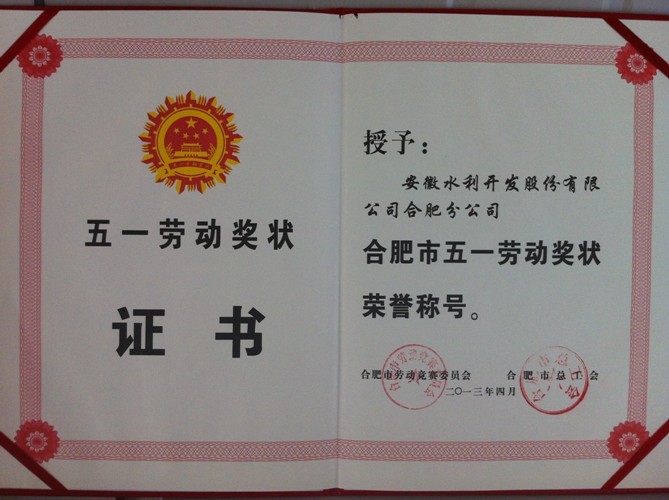 2013年4月30日,安徽水利合肥公司被合肥市勞動競賽委員會、合肥市總工會授予了合肥市“五一勞動獎狀”榮譽稱號,這是合肥公司首次獲此榮譽。