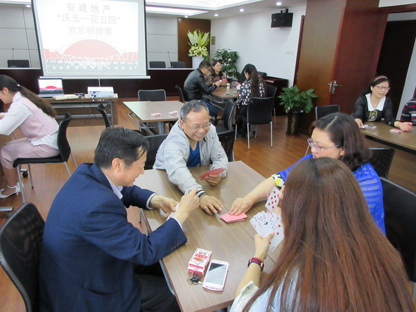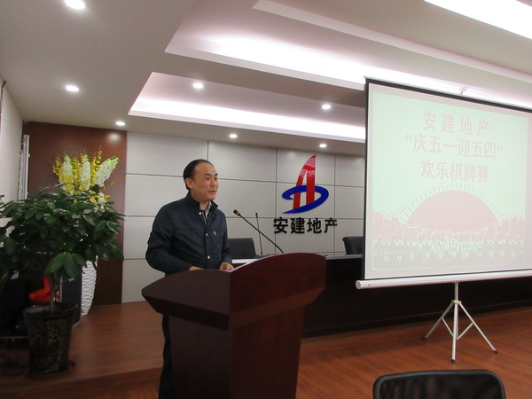 為熱烈慶?!拔逡弧眲趧庸?jié),進一步豐富安建地產(chǎn)公司員工的業(yè)余生活,緩解緊張的工作壓力,4月29日下午,安建地產(chǎn)公司舉辦了“迎五一慶五四”歡樂棋牌賽活動,公司總經(jīng)理、黨總支書記楊斌參賽并進行賽前動員講話。