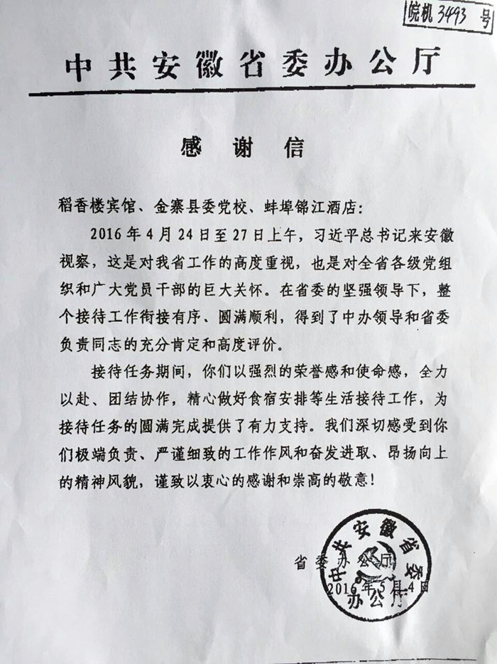 省委辦公廳發(fā)來感謝信肯定安徽水利錦江大酒店接待工作