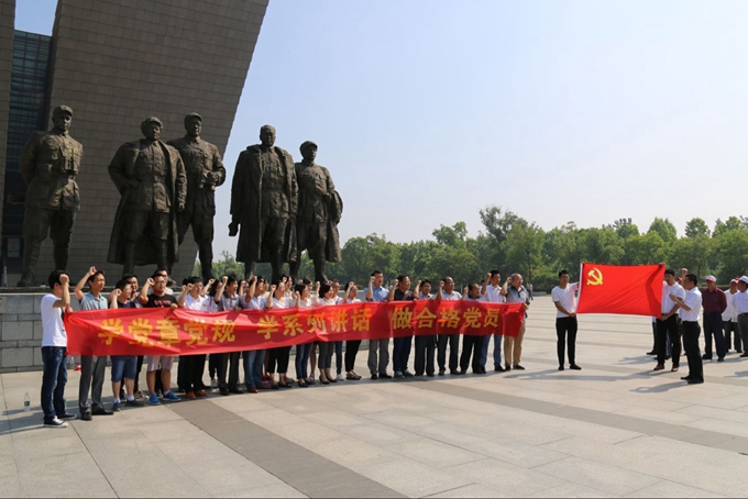 在渡江戰(zhàn)役紀(jì)念館雕像前,在交航公司機(jī)關(guān)支部委員帶領(lǐng)下,大家面對(duì)鮮紅的黨旗舉起右拳,莊嚴(yán)宣誓。