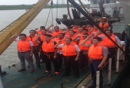 2016年6月23日下午,安徽省交通航務(wù)工程有限公司副總經(jīng)理汪崇龍、疏浚分公司總經(jīng)理董雙武等分公司領(lǐng)導一行蒞臨青弋江疏挖工程項目視察,汪崇龍一行檢查了項目各施工船舶的安全生產(chǎn)情況,隨后在皖蛟龍?zhí)柹相嵵嘏e行了安全宣誓活動。宣誓由疏浚分公司副經(jīng)理商顯鋒領(lǐng)誓疏浚分公司領(lǐng)導及各項目部負責人、船隊代表參加宣誓。