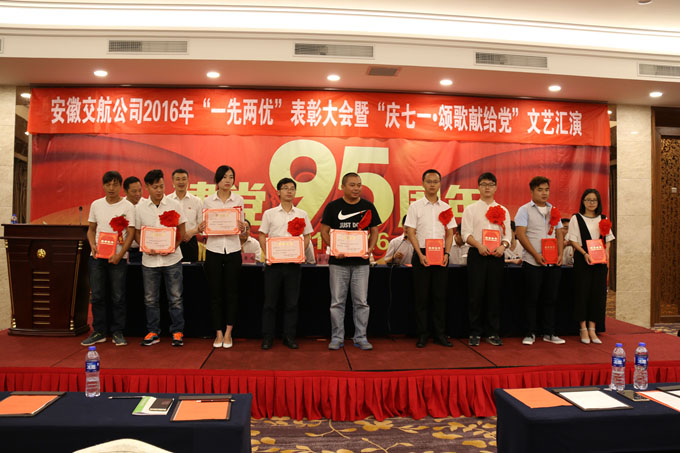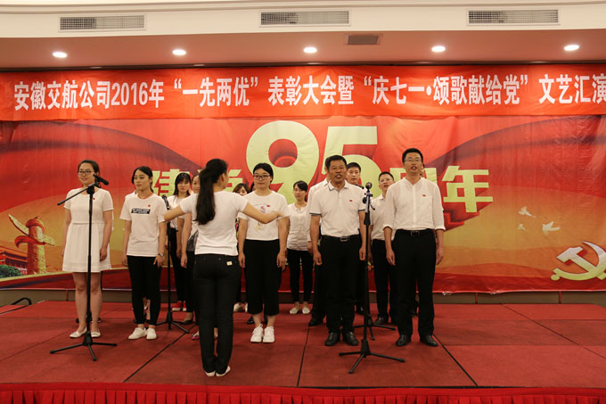 為隆重紀(jì)念中國(guó)共產(chǎn)黨成立95周年,6月22日下午,安徽交航公司順利召開(kāi)了2016年“一先兩優(yōu)”表彰大會(huì)暨“迎七一•頌歌獻(xiàn)給黨”文藝匯演。交航公司領(lǐng)導(dǎo)班子成員、機(jī)關(guān)全體黨員、各黨(總)支部負(fù)責(zé)人、獲獎(jiǎng)黨員、入黨積極分子共計(jì)100余人參加了會(huì)議,會(huì)議由交航公司紀(jì)委書(shū)記、工會(huì)主席李楊主持。