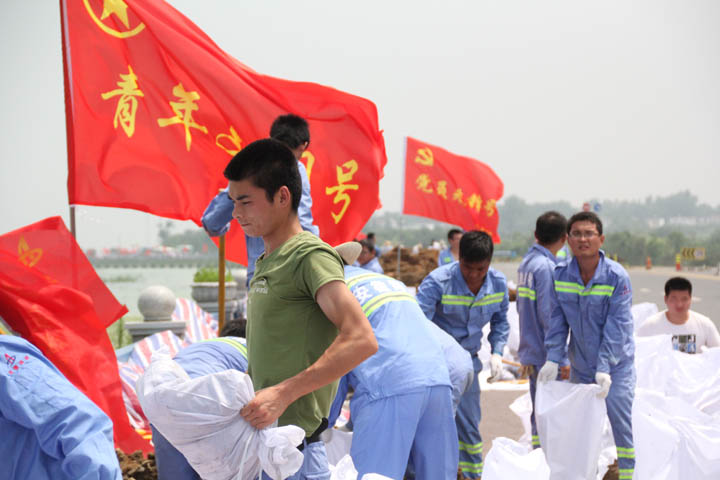 7月9日的合肥,驕陽似火。巢湖大堤上,“黨員先鋒號”、“工人先鋒號”、“青年突擊隊(duì)”等紅旗鮮艷奪目,迎風(fēng)招展。近兩千名路橋員工分工有序,鏟土、裝袋、搬運(yùn)、壘墻,在他們的揮汗如雨中,防洪墻一米一米的延長。“你們干活真是太拼了,這么熱的天氣,在這太陽底下站一小會(huì),我都受不了”,附近的一位居民感嘆道。連續(xù)超過60小時(shí)的奮戰(zhàn),領(lǐng)導(dǎo)、員工吃住在大堤,渴了喝口礦泉水,餓了吃口饅頭。憑著這股狠勁和韌勁,7月10日下午,6500多米長的防洪墻在全線第一個(gè)完成,給合肥市民交上了一份滿意答卷。
