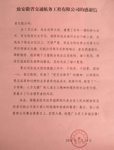 7月28日,安徽交航收到一份來自南陵縣防汛抗旱指揮部的感謝信,感謝我公司在此次搶險(xiǎn)救災(zāi)過程中做出的巨大貢獻(xiàn)。