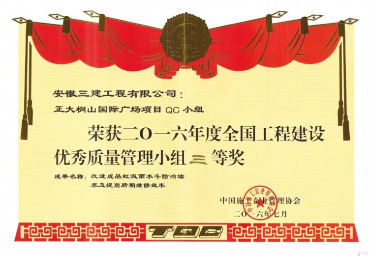 近日,從中國(guó)施工企業(yè)管理協(xié)會(huì)傳來(lái)喜訊,安徽三建安裝公司正大桐山國(guó)際廣場(chǎng)項(xiàng)目QC小組榮獲2016年度全國(guó)工程建設(shè)優(yōu)秀質(zhì)量管理小組三等獎(jiǎng),這是安裝公司繼去年獲得全國(guó)QC小組獎(jiǎng)項(xiàng)的又一重要獎(jiǎng)項(xiàng)。