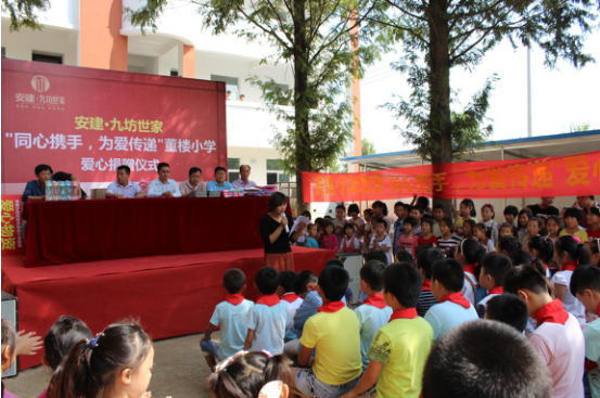 董樓小學位于潁東區(qū)冉廟鄉(xiāng)深度貧困鄉(xiāng)——丁寨村,貧困人口達4661人,由于交通閉塞,辦學條件差,之前董樓小學的教學樓僅是幾間小平房,直到今年在政府大力支持下建成現(xiàn)在的新教學樓。安建·九坊世家這次愛心捐贈活動為這些貧困學子們帶去關愛和信心,幫助他們在圓夢道路上越走越遠。